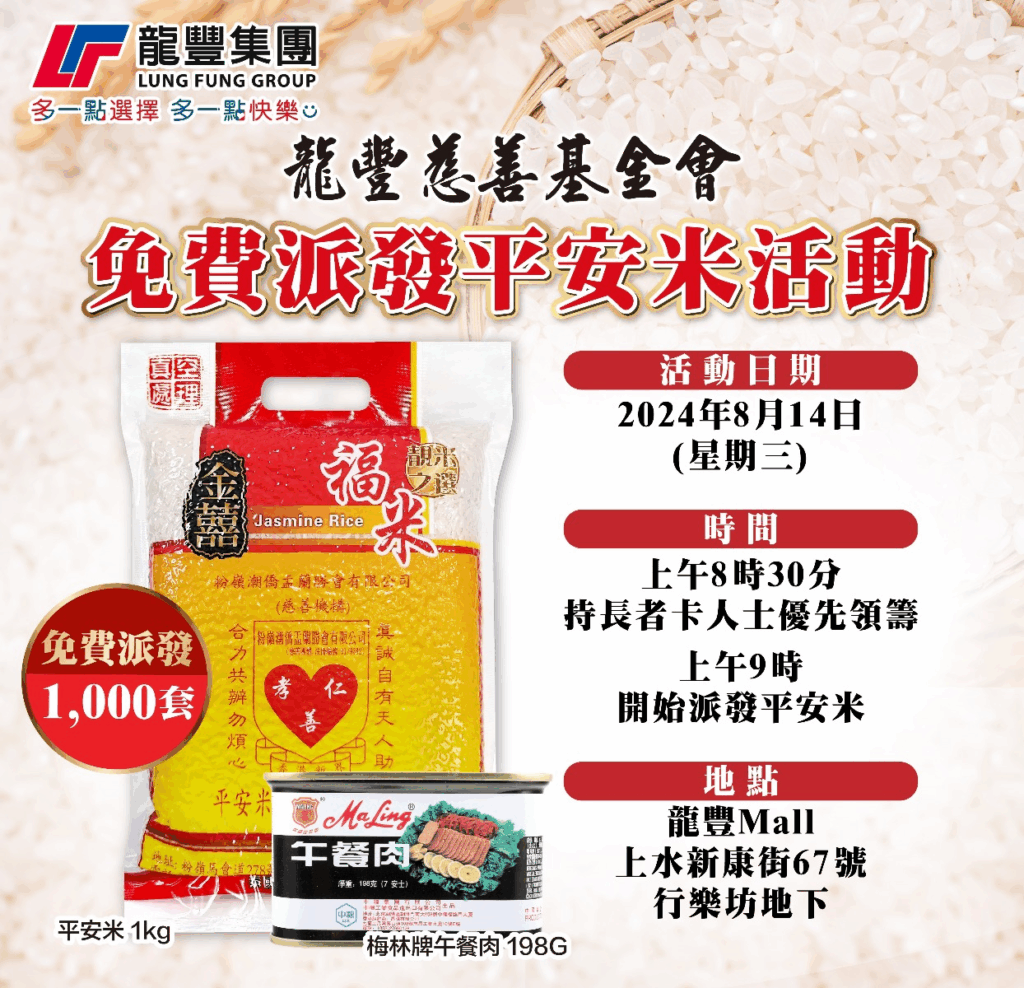 龍豐慈善基金會早前於8月14日舉辦派發平安米活動,於上水行樂坊分店免費派發平安米及梅林牌午餐肉各1000件,各位街坊老友記反應熱烈希望拎返個好意頭,祈求身體健康,平平安安。